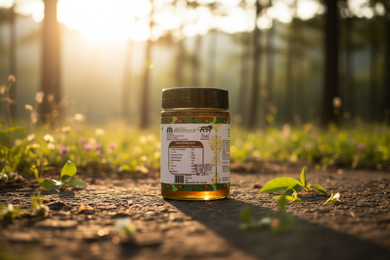 This is a Rich, Raw, and Pure Organic Honey sourced from the dense, evergreen forests of the Western Ghats.